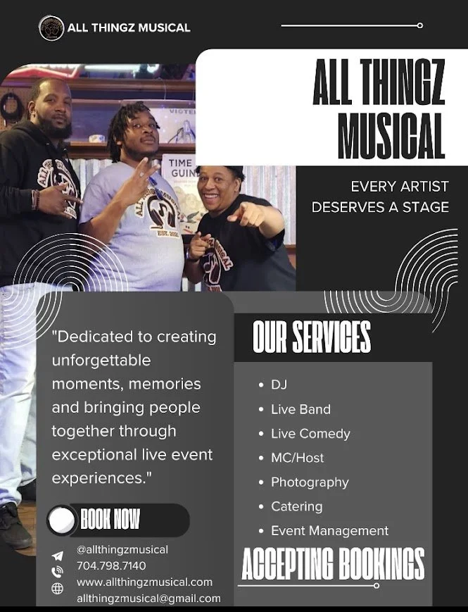 All Thingz Musical is a full-service entertainment and event experience company dedicated to creating unforgettable moments that bring people together. Specializing in live entertainment and event production, All Thingz Musical offers DJ services, live bands, live comedy, MC/hosting, photography, catering, and event management. With a commitment to professionalism, creativity, and high-energy experiences, All Thingz Musical provides artists and audiences with a platform where every event feels memorable and impactful.