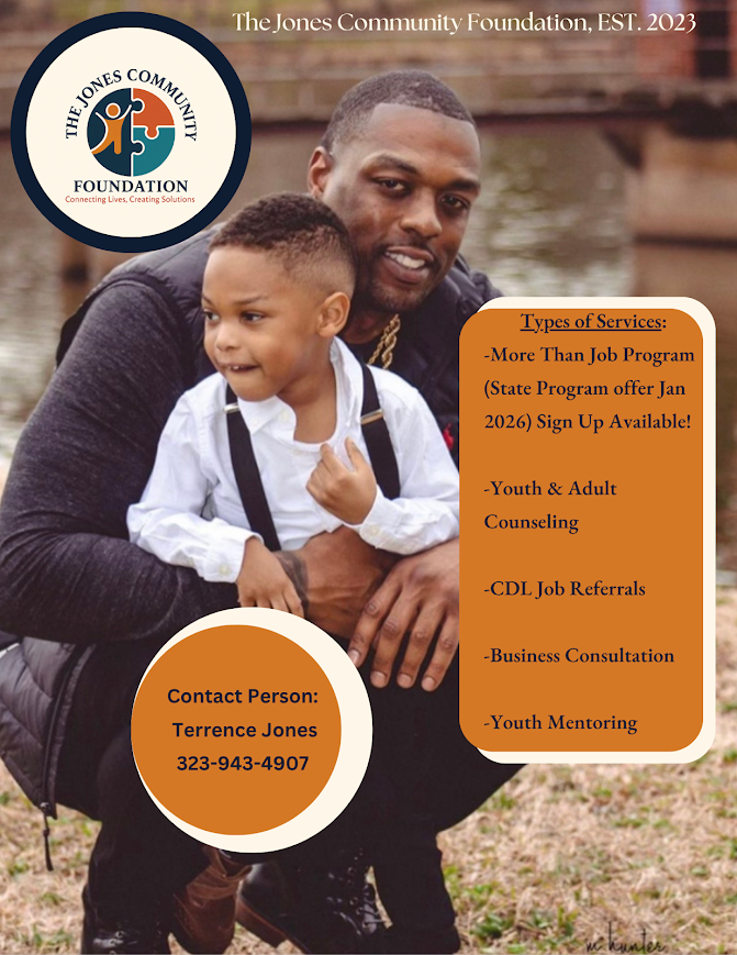 The Jones Community Foundation is a community-centered organization committed to strengthening individuals and families through workforce readiness, mentorship, and supportive services. Established in 2023, the foundation focuses on creating pathways to stability and growth by offering programs such as the More Than A Job workforce initiative, youth and adult counseling, CDL job referrals, business consultation, and youth mentoring. Through practical support and meaningful relationships, The Jones Community Foundation works to connect lives and create solutions that promote long-term success.